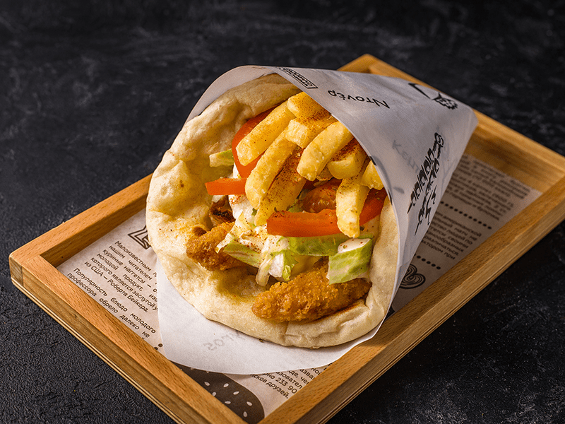 лепешка, креветка в панировке, фри, помидор, салат, соус Тар-тар