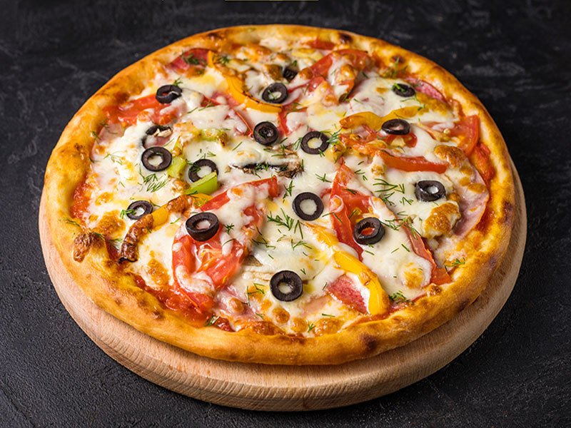 салями, ветчина, бекон, болгарский перец, помидоры, грибы, маслины, зелень, сыр